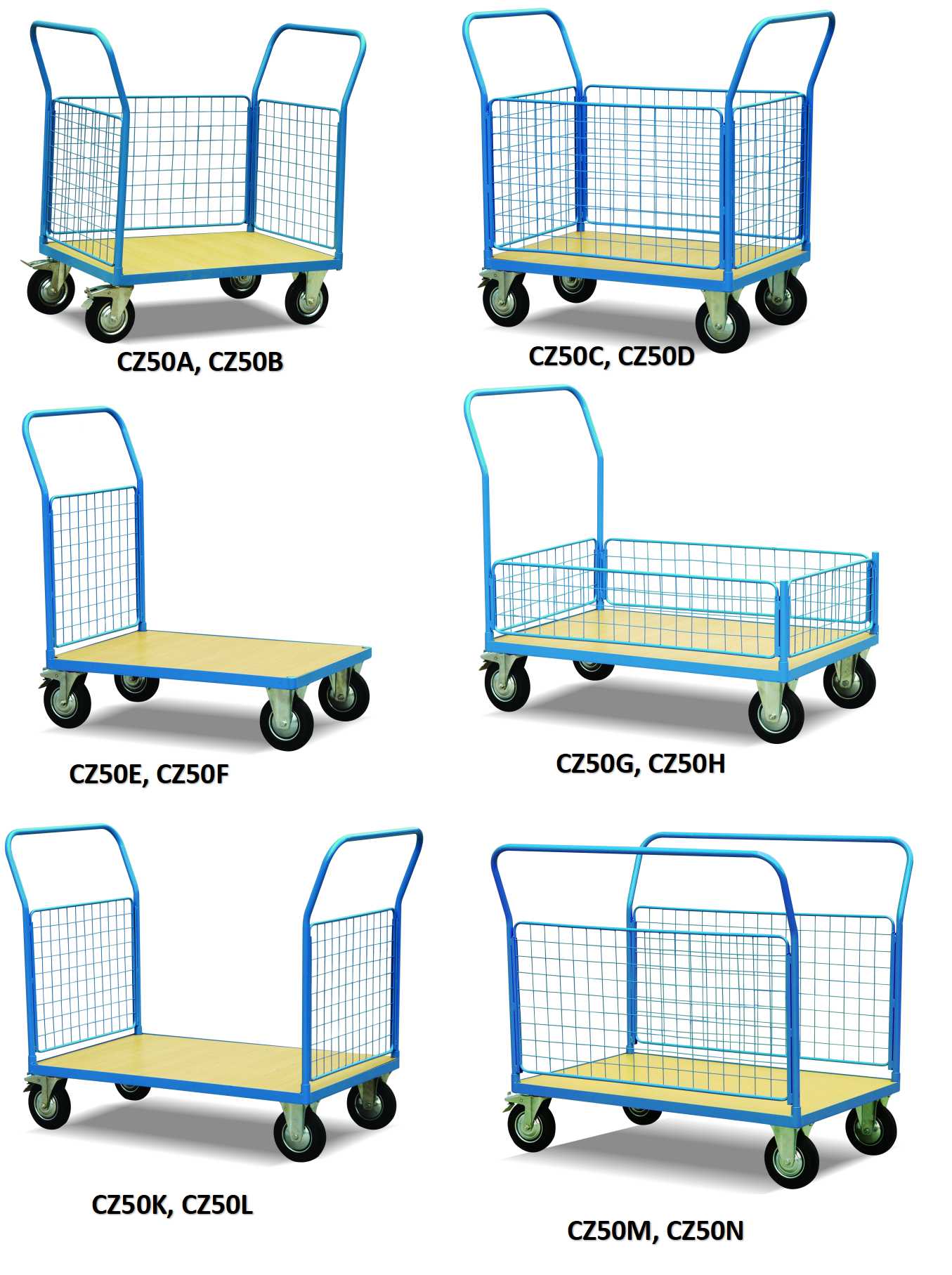 Wózek platformowy serii CZ z koszem siatkowym do identyfikacji wizualnej w ruchu, wózki platformowe ze stalowymi panelami z siatki. Panele zdejmowane indywidualnie. Obciążenie widoczne ze wszystkich kierunków. Podwozie wykonane z kątownika żelaznego. Panele boczne wykonane ze stali siatkowej.